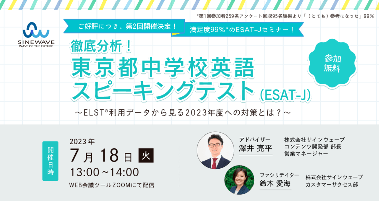 【7月18日(火)無料オンラインセミナー】徹底分析!東京都中学校英語スピーキングテスト(ESAT-J)ご好評につき第二回開催決定!