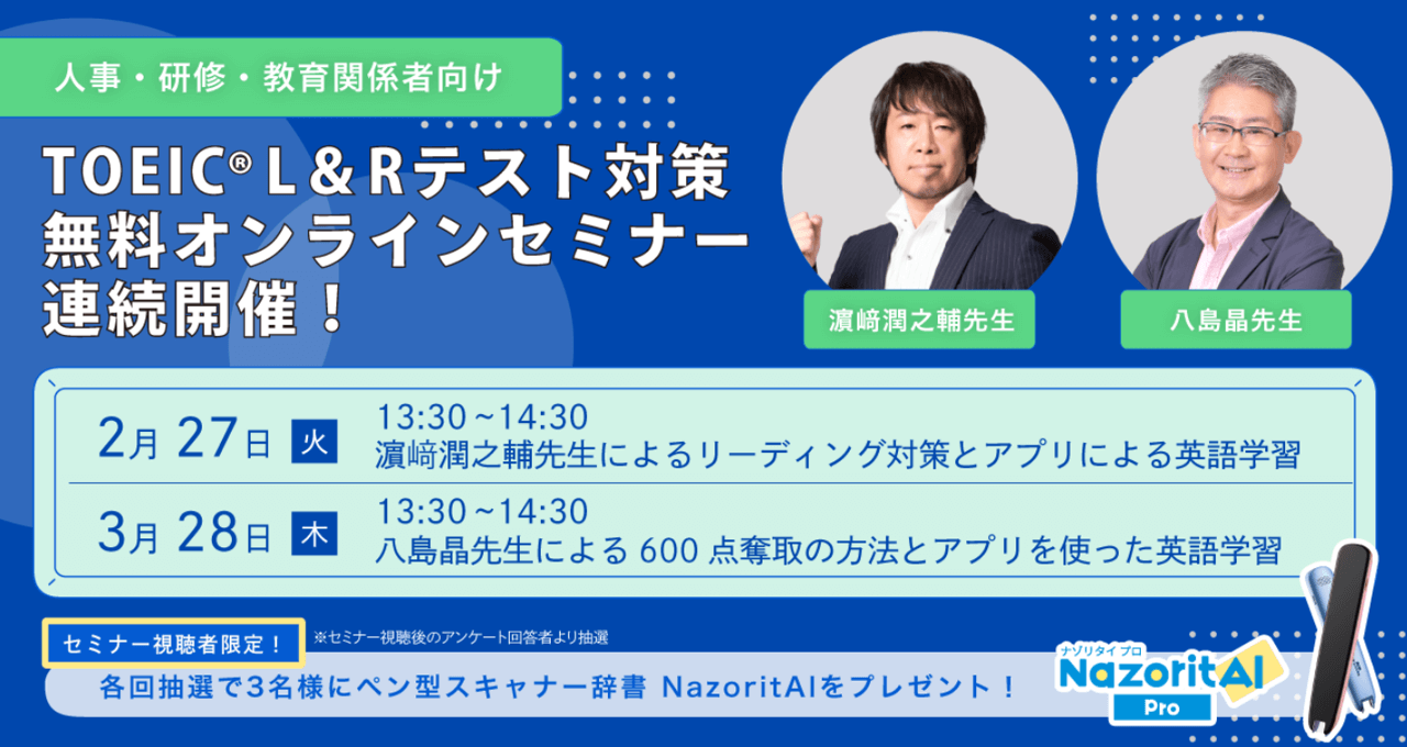 【TOEIC(R)L&Rテスト満点講師による連続セミナー開催】濱崎潤之輔先生、八島晶先生によるTOEIC(R)L&R TEST対策講義とAI自動採点アプリを使った英語学習とは?