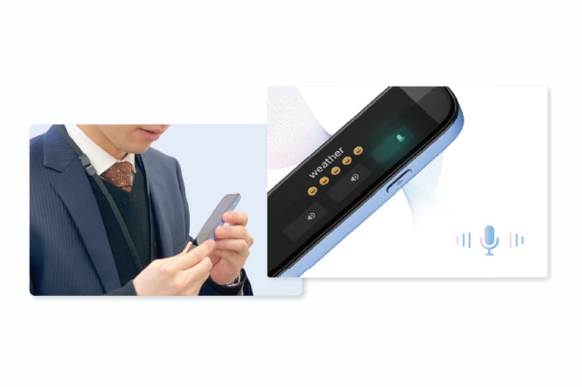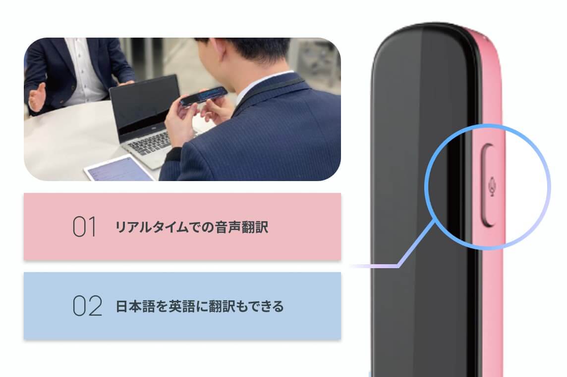 本体側面のマイクボタンを押しながら喋るだけでリアルタイムで音声を翻訳。英語を日本語に翻訳するだけでなく、日本語を英語に翻訳も可能